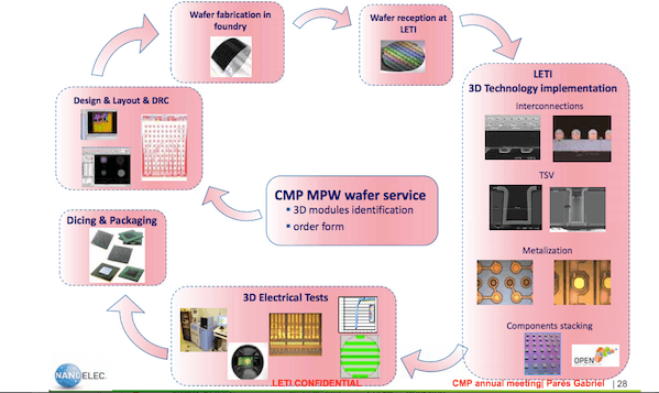Up until now, the missing piece for 3D IC MPW was 3D assembly processes such as via-last TSVs, microbumps, Cu pillars, “Now we can select a subset of what Leti is offering (through it’s Open3D consortium) and share the cost between different users to have an affordable cost for chip-on-wafer packaging,” explained Torki. These 3D modules will enable a wide panel of new, full 3D architectures, like multiple-die stacking with flip-chip, side-by-side heterogeneous integration, and 3D partitioning of different CMOS dies issued from CMP runs. CMP’s goal is to validate concepts for new designs. “We’re not addressing products, we’re addressing the feasibility of a challenging device. After we know, we won’t be providing the mass production, “ he said.