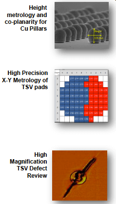 KLA Tencor’s big news at this year’s ECTC was the launch of its CIRCL-AP platform for all surface wafer inspection and metrology for advanced wafer level packaging (AWLP) and 3D IC in high volume manufacturing (HVM). According to Sumant Sood, KLA Tencor, the platform comprises 3 main modules: the 8-series for frontside inspection and metrology, the CV350i for edge inspection and metrology, and the Micro300 metrology for 2D and 3D metrology. Sood noted that the Micro300 is the most critical to 3D integration for process control (Figure 1). “TSV processing means lots of 3D features. We need to measure the height and diameter of those features and this is the right module for that,” he said.