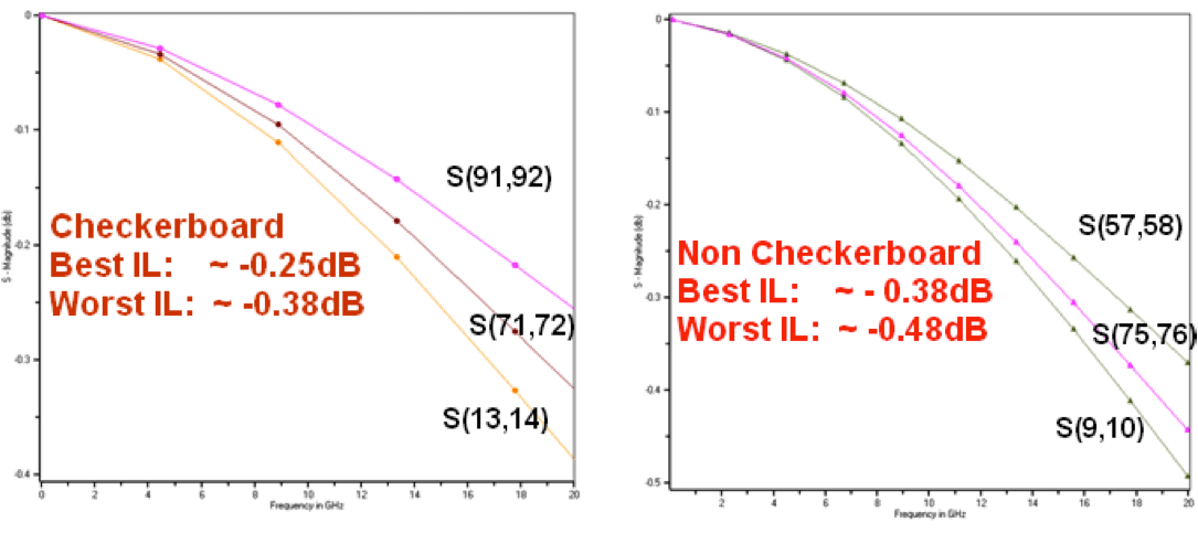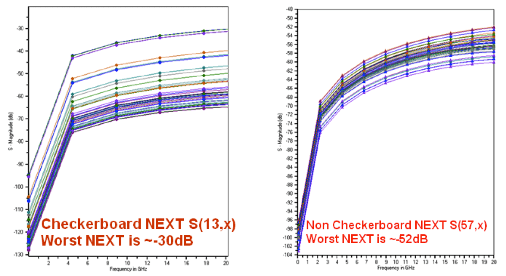 For the Checkerboard assignment, the NEXT is consistent between S(13,x), S(71,x) and S(91,x). All show a worst-case NEXT approximately -30dB at 20GHz. But if we look at the Non Checkerboard pattern and review the NEXT for the isolated signal with ports 57 and 58, we should expect and do see a dramatic improvement of 22dB better noise immunity (NEXT = -52dB at 20GHz). But how has this assignment altered the NEXT on other signals? Examining Port 9’s NEXT, we determine that the worst NEXT is now -18dB at 20GHz, 12dB; poorer than the ‘uniform’ NEXT achieved with the Checkerboard pin assignment. Although the Non Checkerboard signal assignment has helped with one signal, other signals have been significantly degraded.