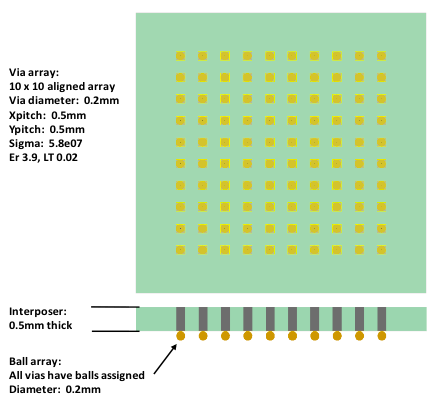 1. Creating the basic design required less than 5 minutes to define via and ball profiles, create the array, create a metal layer (pads) between interposer/ball and apply balls.