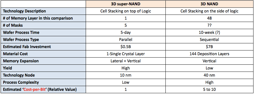 While 3D super-NAND requires advanced feature size (i.e. 10nm) for cell formation to achieve high cell density, it takes only five mask steps and five days of processing time, noted Lee. So, 3D super-NAND could achieve high throughput with limited dependence on expensive lithography processing. In parallel, memory logic wafer can be manufactured at an old generation fab using affordable lithography processing. Here is the comparison: