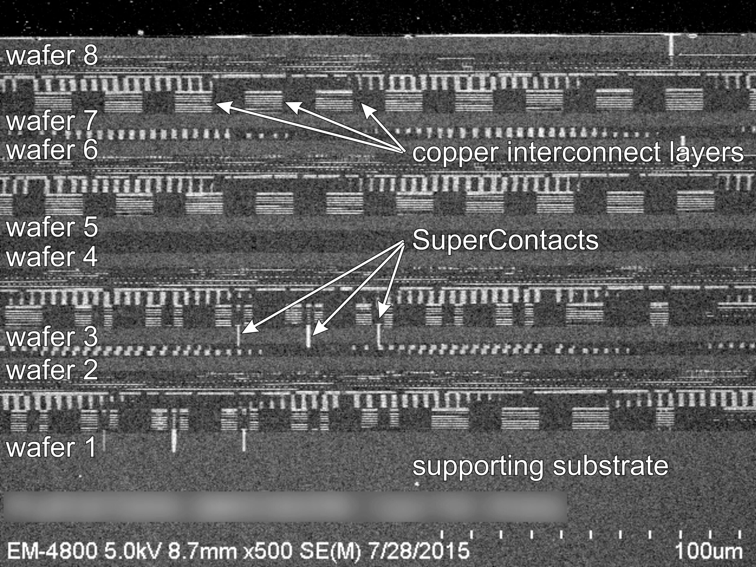 Tezzaron’s approach is quite different: There are no wire bonds, copper pillars, bumps, or underfill between the layers. Rather, the 8-wafer stack contains active CMOS circuitry and tungsten vertical interconnects (SuperContacts™). Wafers are 20µm thick; SuperContacts are 1.2µm diameter, 6µm deep, and can be deployed at a pitch of 2.4µm and require no keep out zones near active transistors.