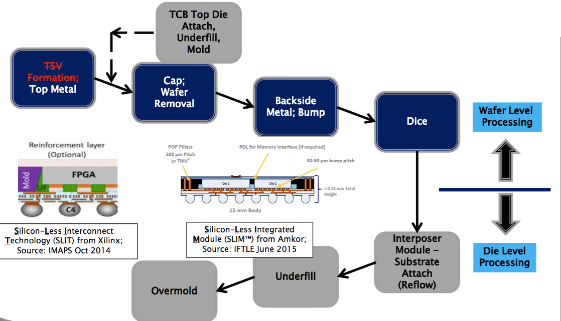 Arkalgud walked us through chip-to-wafer, and chip-to-chip, process flows for interposer integration, identified pain points, and also looked at low cost alternatives being developed. Both SPIL’s silicon-less interposer technology (SLIT) and Amkor’s (SLIM) eliminate the TSVs, but have warpage concerns.