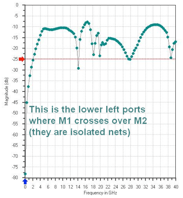 The last check examines signal-to-signal noise where the horizontal RDL crosses over the vertical RDL. We could have examined all of the NEXT and FEXT for the various signal lines, but I wanted to view the noise isolation between two orthogonal signals separated by 0.01 mm. With the same -25dB noise isolation threshold, we can see that these orthogonal lines have significant noise between them (approaching -7dB @ 17 GHz).
