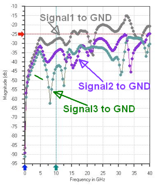 Next, let us look at the PDN to signal noise, these are the 3 green circles between GND and 3 RDL vertical signals shown in the structure above. Signal 1 has the shortest distance to GND plane, Signal 2 is farther away and Signal 3 is the farthest. Again, if -25dB is used as the noise threshold value, we can see that Signal 1 has worse noise and peaks at -15dB @ 33 GHz. Signal 2’s distance from GND plane is sufficient until 39 GHz and Signal 3 also shows improved noise margin until 33+ GHz frequencies. Since the signals are much narrower than the PDN planes in PDN/PDN noise, we have improved noise isolation even though the distance is similar to GND/1.8V planes.