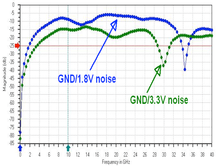 Let us first examine the PDN to PDN noise responses; these are the 2 red circles between GND/1.8V and GND/3.3V shown in the structure above. We could have also examined 1.8V and 3.3V PDN but have not for brevity.