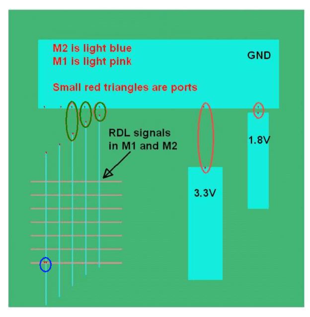 As discussed in previous 3D InCites blogs, Path Finding allows designers to quickly test various ideas to help separate the viable from the inane. Part of the Path Finding needs to investigate noise between: µvia to µvia, TSV to TSV, signal to signal, PDN to signal, and PDN to PDN. The structure in Figure 1 is a simple test structure (no µvias or TSVs) that I have ported to simulate noise between various ports. The red, green, and blue circles will be the noise responses discussed below. (Er 3.9, LT 0.02, Sigma 5.8e7, metal thickness 0.01 mm and dielectric between M1 and M2 of 0.01mm, all RDL is 0.05mm wide)