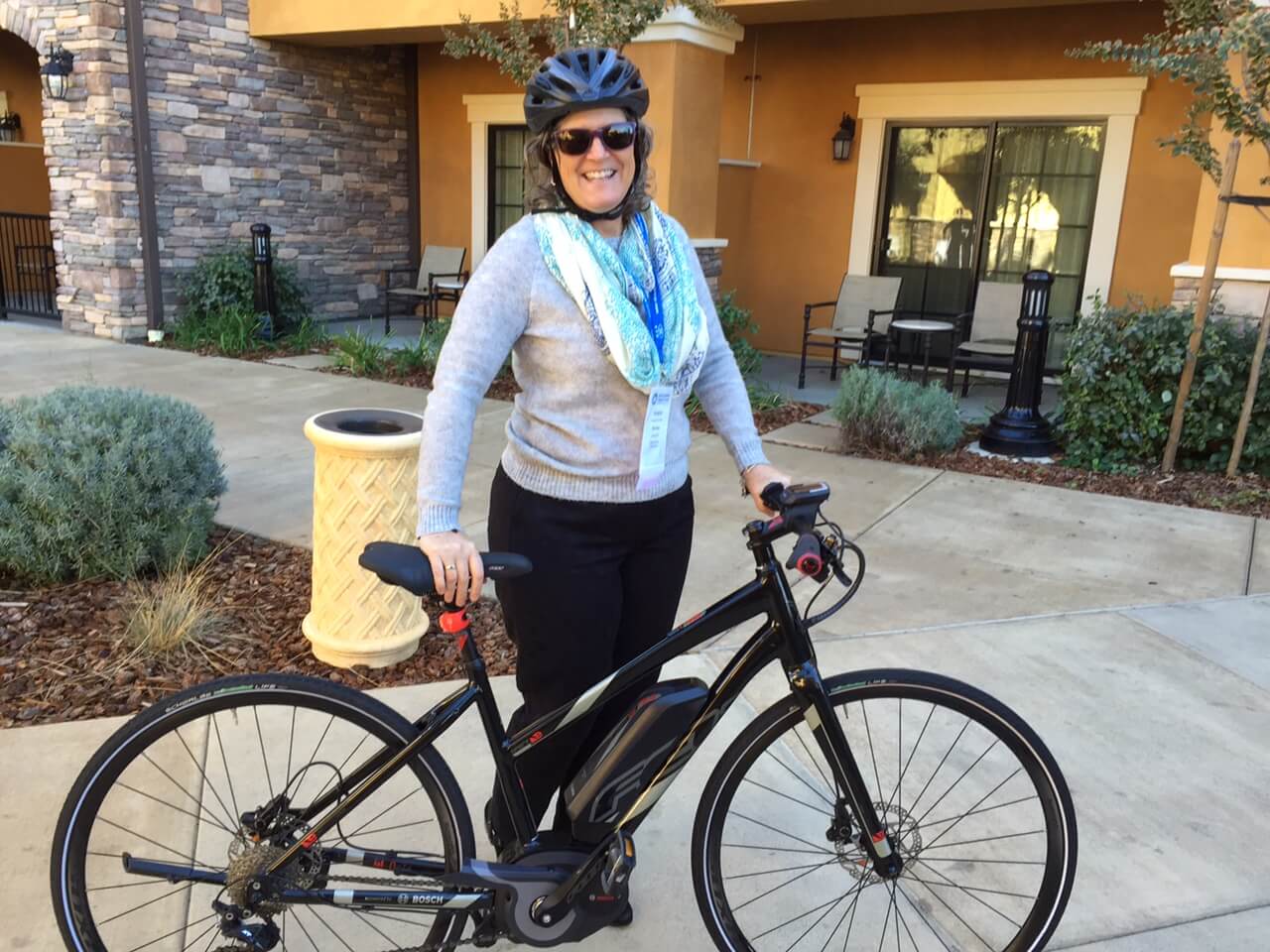 The magic provided by Bosch includes a battery pack; a 250 watt drive unit consisting of a torque sensor, pedal speed sensor, and wheel sensor, motor and gearbox; and control unit that allows you to select how much tailwind you want. I can personally attest that it’s easy to handle, and super fun to use. It was such a beautiful afternoon in Napa when I took my test ride, and the pedaling was so effortless, that I almost just took the afternoon off. But I knew I couldn’t hog all the fun, so I reluctantly returned so someone else could take it for a spin (thanks Kathy Cook, for letting me take a video of you on the bike!)