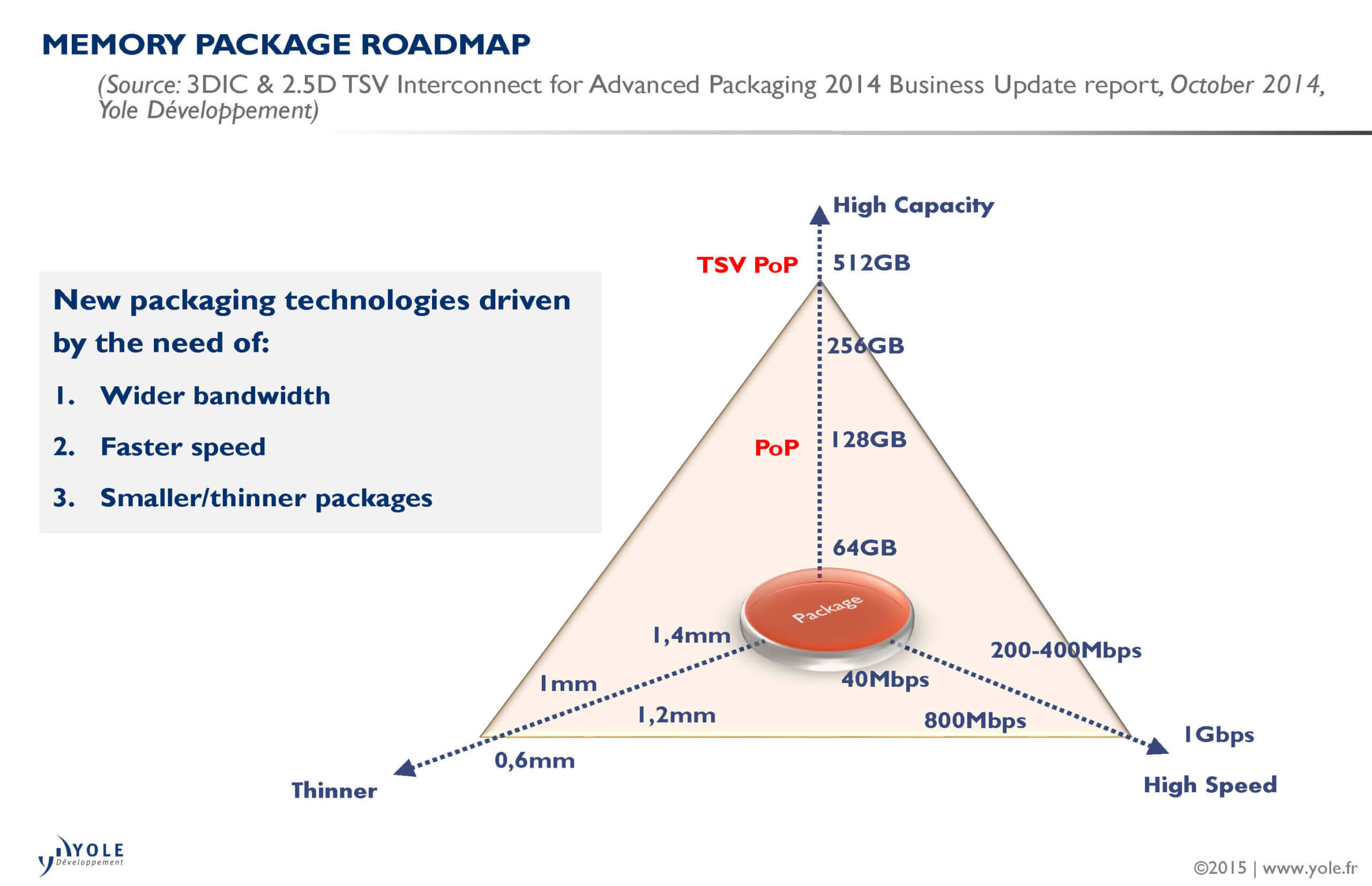 Last year, in its 3D IC report entitled 3DIC & 2.5D TSV Interconnect for Advanced Packaging 2014 Business Update (Yole Développement, October 2014), Yole already announced the starts of high volume production. “3D TSV is finally becoming a reality in the memory industry,” says Thibault Buisson, Technology & Market Analyst, Advanced Packaging at Yole. Indeed several memory makers announced the volume production this year, to meet the needs of high performance computing and servers applications. According to Buisson, the memory market is driven by the need to increase performance such as higher bandwidth, faster speed and smaller/thinner packages.