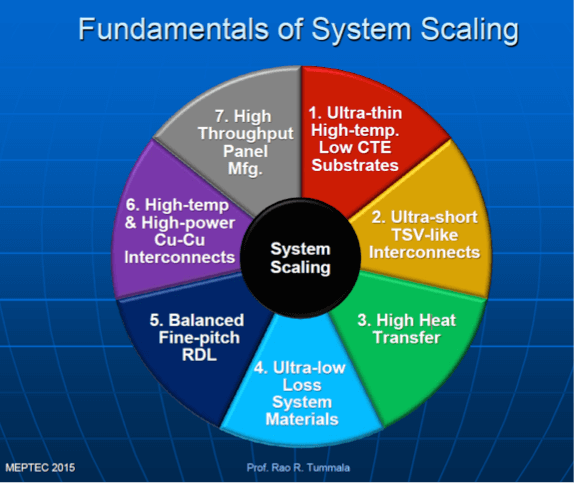 A widely-known IC packaging expert, Professor Rao Tummala from Georgia Tech, gave the keynote on Tuesday morning. He contrasted the many benefits of system scaling versus the diminishing returns the traditional transistor scaling offers and explained how his Package Research Center (PRC) works with IC vendors and many key players in the IC packaging supply chain. Among other key points, Prof. Tummala showed, what he considers are the fundamentals of system scaling (Figure 1).