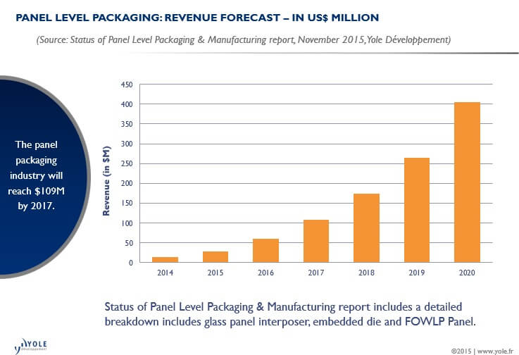 Under the new advanced packaging analysis entitled “Status of Panel-Level Packaging & Manufacturing” released by Yole last November, the market research and strategy consulting company estimates, the panel packaging industry will reach US$ 109 million by 2017, with a market value of US$ 405 million by 2020.