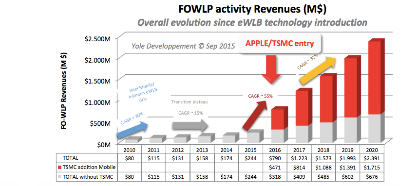 According to Beica, the entry of Apple/TSMC into the FOWLP space caused Yole to adjust its forecast of CAGR for the 2014-2016 from 15% to 55%, with and additional jump of 32% between from 2016-2020. Additionally, Beica predict that the market for FOWLP will exceed $2B by 2020 (Figure 4). TechSearch International Inc. predicted an overall CAGR for FOWLP of 87% from 2015-2020.