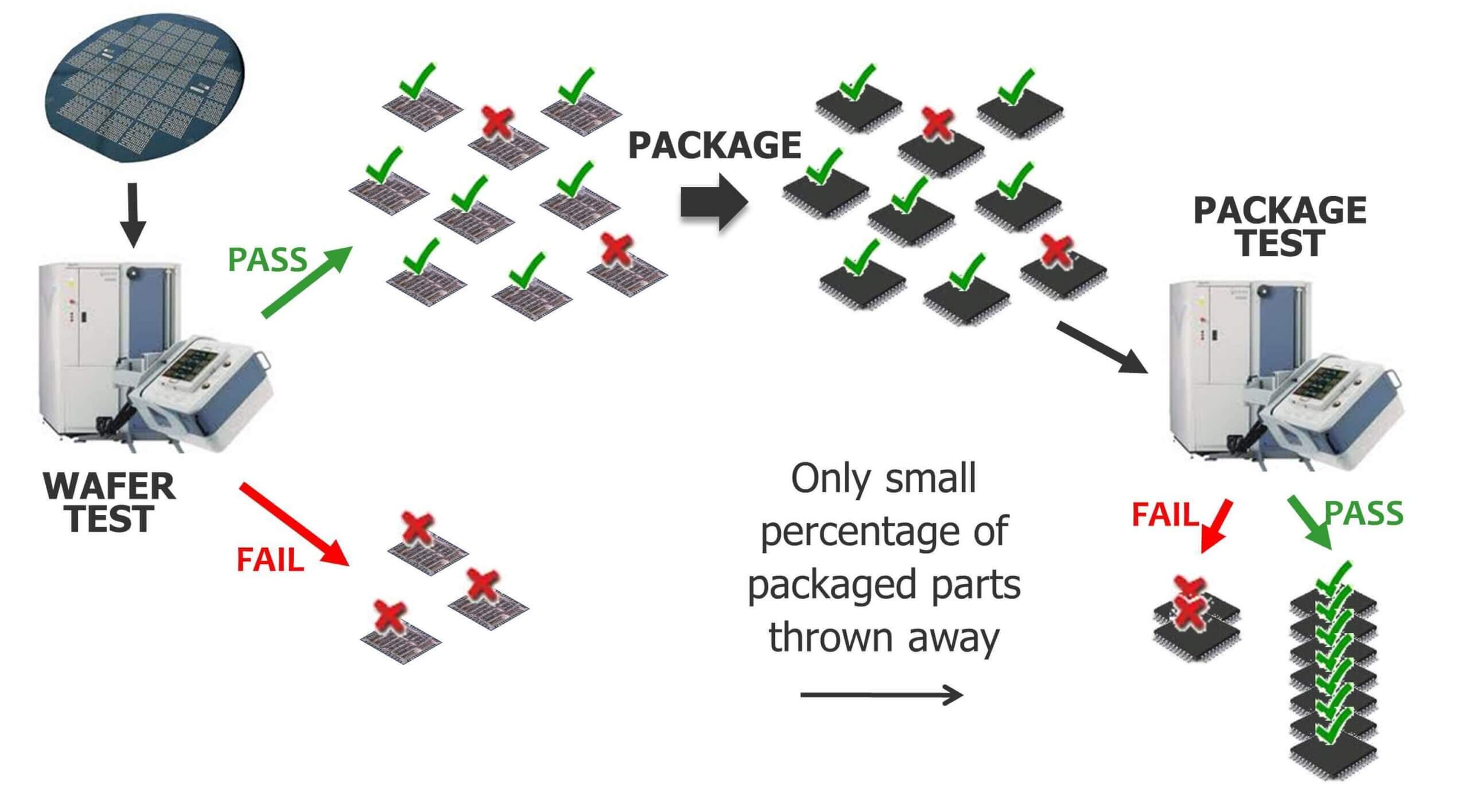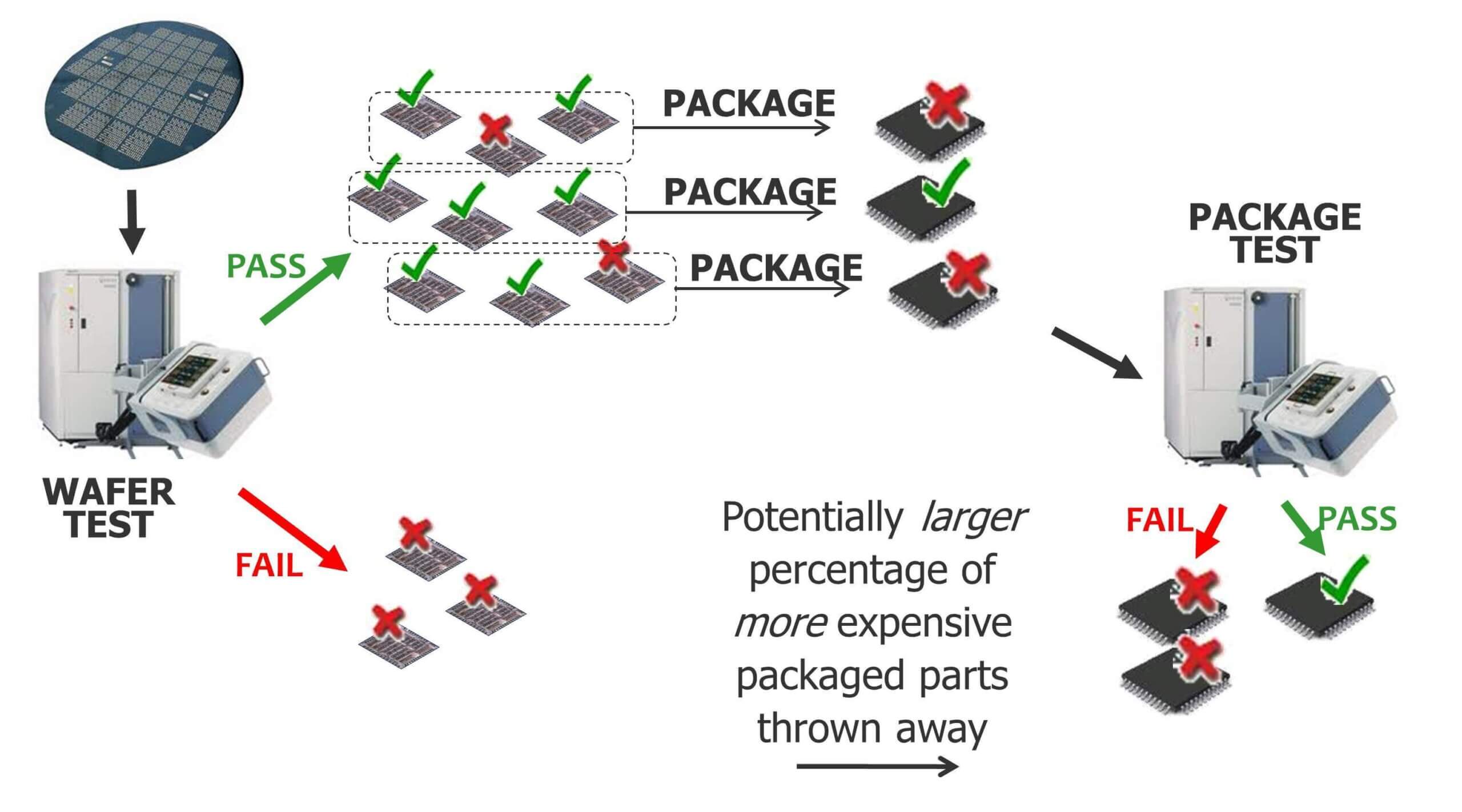 Before 3D testing, the wafer went through wafer test; some die passed, some failed. The good die went on to packaging, then packaging test, where a few more (escaped) failures would be found (Figure 1).