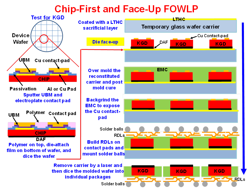 As you all know, warpage is a critical issue for fan-out wafer/panel level packaging. Many people like to talk about it, however, most of them don’t know what they are talking about. Let’s use the chips first, face-up fan-out wafer level packaging (FOWLP) approach as an example. Also, let’s consider three redistribution layers (RDLs). The process flow is schematically shown in the figure below.¹ In this case, there are at least 6 different warpage issues affecting the FOWLP process.