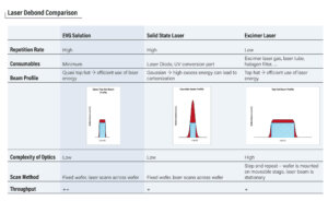 EVG’s new laser debonding solution incorporates a solid-state UV laser and a proprietary optical setup that shapes the Gaussian beam profile of the laser into a “quasi top-hat” beam profile. By employing this optical setup, EVG achieves a highly reproducible beam with minimal heat introduced to the device wafer and excellent spatial control. This enables tighter process control, which coupled with the high pulse repetition rate of the laser, the ability to conduct laser treatment and wafer separation in a single chamber to minimize handling time, and the ability to scan across the surface of a fixed wafer leads to a well-controlled, high-throughput and low-temperature debonding process.