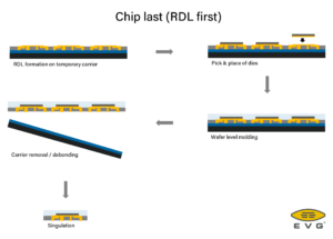 Development of this system was motivated by fan-out wafer level packaging (FOWLP) technologies, and particularly RDL-first (chips last) approaches (Figure 1). Wimplinger explained that this is because RDL first involves the build-up of high-density RDL on top of bonding layers, and require a glass carrier with a thin adhesive that can be debonded using low force. And because it requires low temperatures, UV laser debond is ideal for temperature sensitive process steps. Beyond FOWLP, its application space includes memory, interposer, logic, MEMS, and more.