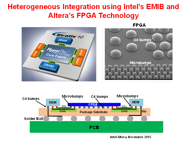 All these indicate that heterogeneous integration is going to take market share away from SoC on high-end applications such as the high-end smartphones, tablets, wearables, networkings, telecommunications, and cloud computing. How to let these dissimilar chips talk to each other? Redistribution layers (RDLs) [7]! These RDLs can be fabricated by such as fan-out wafer-level packaging (FOWLP) technology [8-11] as shown in Figure 4 by STATsChippac, embedded multi die interconnect bridge (EMIB) [12] technology as shown in Figure 5 by Intel, and many other TSV-less interposers [13].