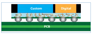 FOWLP brings single and multi-die designs together, combining multiple die from heterogeneous processes into a compact package (Figure 1). The die are embedded in an epoxy mold compound (EMC), then die-to-die and die-to-ball-grid-array (BGA) connectivity are established directly through the package redistribution layer (RDL), without the need for through-silicon vias (TSVs) or a laminate package substrate. While FOWLP typically requires a silicon wafer as a carrier, this wafer does not remain in the package. Eliminating TSVs and the substrate not only reduces production costs, but also enables companies to make very thin packages, which provides electrical advantages.