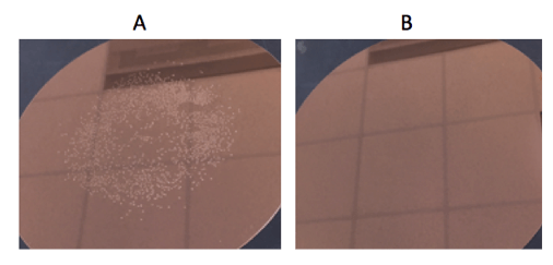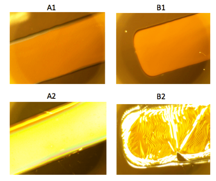 Figure 7 (A) shows a copper layer deposited on top of a high-Tg material that exhibited no surface changes after thermal simulation. When the copper layer was deposited onto a low-Tg material, as shown in Figure 7 (B), wrinkles were observed after thermal simulation. These wrinkles will prevent further device processing; thus, high-Tg materials may have more advantages than low-Tg materials.