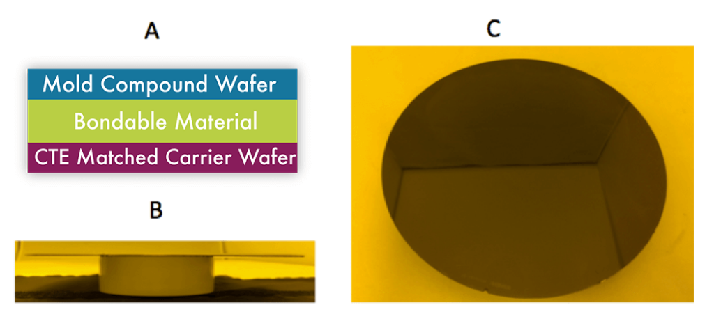 When a CTE-matched carrier wafer is not available, using a material set that can be bonded at room temperature and cured at low temperature is successful at avoiding wafer warpage. In this example, a release layer (Material B) is spin-coated on the reconstituted device wafer, while a thick layer of low-temperature curable Material C is applied to the carrier wafer, and subsequently bonded. After thermal simulation at 250°C for one hour, the bonded wafer pair did not show any voids, delamination or observable warpage. The high melt viscosity of both protective Material B and curable Material C ensures adequate mechanical strength at high temperature. Moreover, the low Young’s modulus of curable Material C (3 MPa) does not introduce further stress to the bonded wafer pair. After successful thermal simulation, the bonded wafer can be either mechanically debonded or laser debonded, and the protective Material B can be cleaned by an organic solvent.