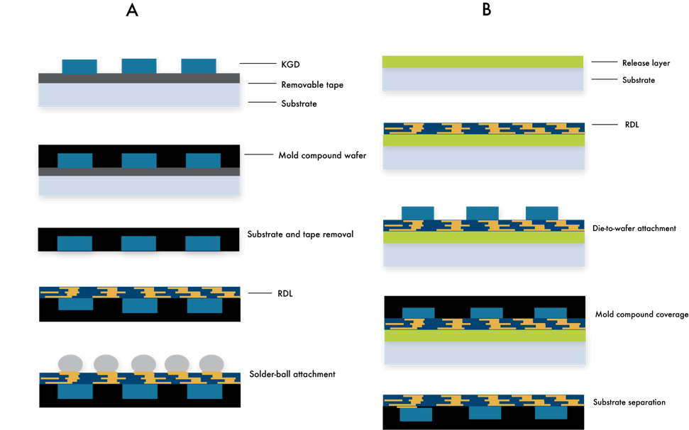 A variety of process flows have been developed to meet flexible design requirements for a chip-first approach (Figure 1A). [2,3] In general, KGD are placed on a substrate that has been laminated onto a removable tape. Mold compound material is then layered over the KGD and cured. The substrate is subsequently separated from the lamination tape, followed by RDL buildup and solder-ball attachment. In the last step, the wafer is singulated for future processing.