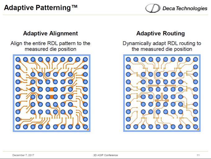 Chris Scanlan from Deca, a Cypress subsidiary, talked about their M-Series packaging technology’s capabilities and highlighted the proven benefits of Adaptive PatterningTM techniques that compensate for die alignment variations and needed routing changes to improve manufacturing yield. See Figure 7 with examples of adaptive placement and routing. This is an especially important technology for the emerging panel-level processing technologies, where accurate alignments are more difficult to achieve than on wafers. FYI: ASE licensed this technology and invested $ 60 M in Deca in 2016.