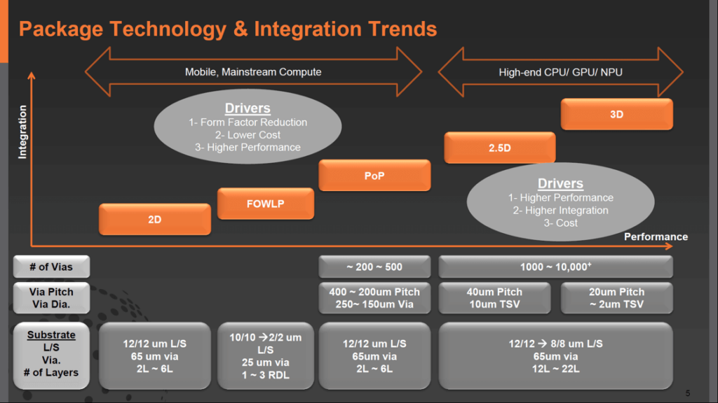 We no longer have one major application, like mainframes, PCs, and smartphones, driving the progress of primarily digital SoCs; but rather face a diverse spectrum of lower volume opportunities that often require a combination of heterogeneous functions. Significant changes are needed to keep/accelerate our industry’s growth, like utilizing higher-density IC packaging for heterogeneous integration, because it’s the most promising approach for system scaling in the foreseeable future.