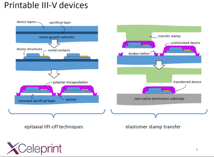 X-Celeprint’s Kanchan Ghosal also focused on microprinting and presented how his company uses epitaxial lift-off techniques and elastomer stamps (see Figure 6) to transfer tiny devices onto larger dies, interposers or substrates. He stated that the displacement error at 3 s is +/- 1.5mm.