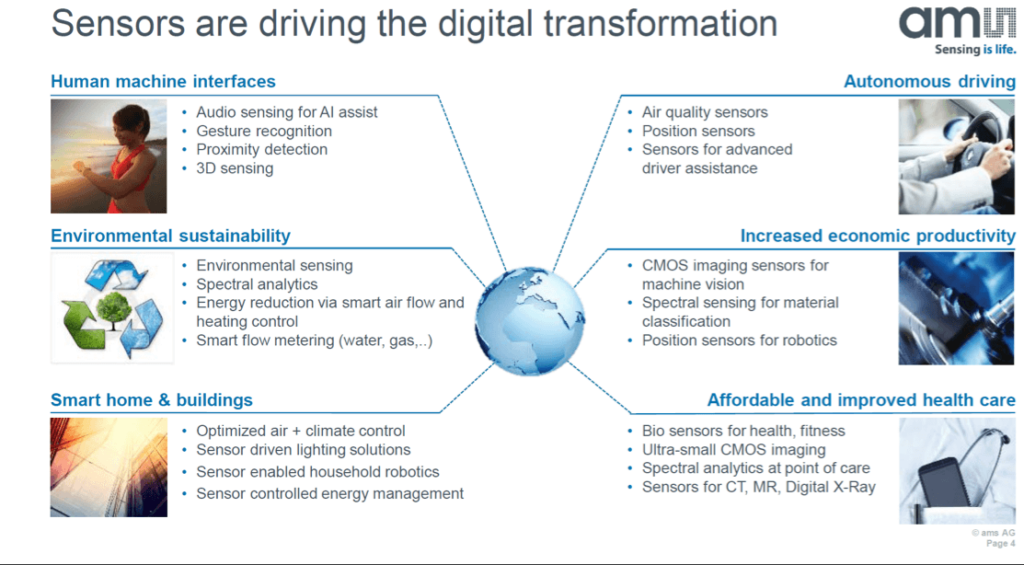 Franz Schrank from amsAG in Austria showed examples how ams’ developers serve sensor applications with their own 2.5/3D platform solutions. He explained the essential role sensors play in the transformation of analog signals around us to digital data, suitable for processing. He categorized ams’ target markets as shown in Figure 4.