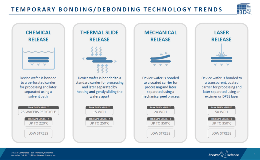 Kim Yess from Brewer Science showed a very clear overview of temporary bonding/debonding steps, discussed these alternatives and highlighted their specific challenges (Figure 3). She also talked about the evolution in substrate buildup and explained the need for developing new materials for advanced wafer and panel-level packaging.