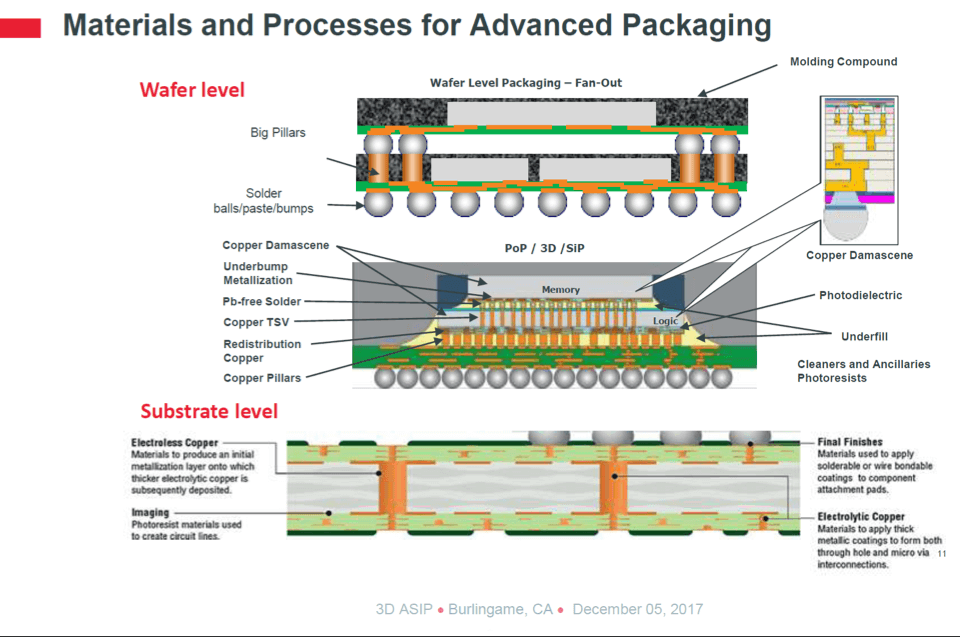 Rozalia Beica explained how the recently merged chemical giants Dow and DuPont address the materials requirements for advanced IC packaging. Figure 1 shows examples where materials play very important roles in streamlining manufacturing and assuring performance and reliability of single and multi-die ICs.