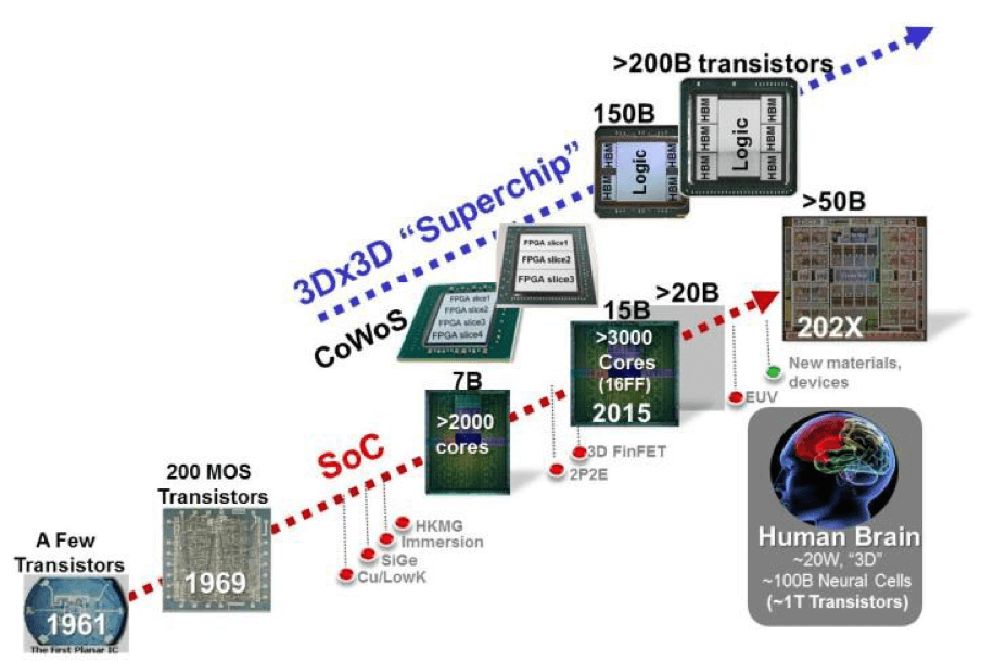 Sun’s presentation started by looking back to the first ICs comprising a few transistors and showed the industry’s progression towards >50 Billion transistor SoCs in the next few years (Figure 4). It also conveyed that TSMC’s so-called “3Dx3D Superchips” will soon exceed 200 Billion transistors. Sun explained that 3Dx3D refers to chips combining 3D transistors (a.k.a. FinFETs), 3D memories (e.g. HBMs) and 3D sensors. They can use TSMC’s CoWoS or InFO technology. He put this list of superlatives into context by pointing out that the human brain’s 3D structure has about 100 Billion neural cells, equivalent to 1 Trillion transistors, operating at only 20 Watts.