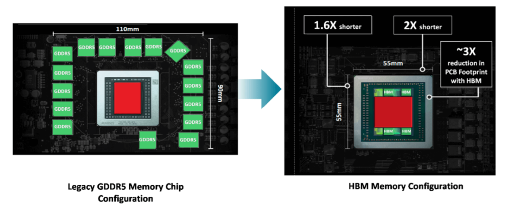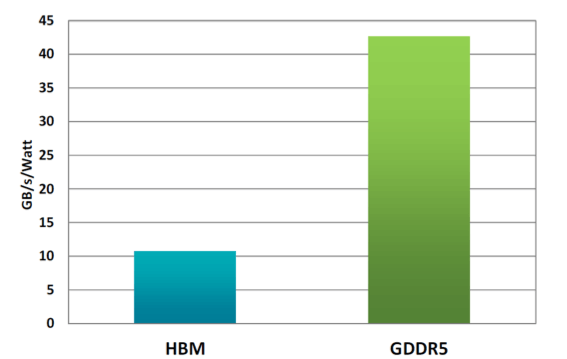 Performance-per-watt, the #1 criteria for success of a high-performance solution, benefits even more. Figure 3 shows that the energy-per-bit access with the previously used GDDR5 memory bank was 4x higher than in AMD’s new interposer design using HBMs.