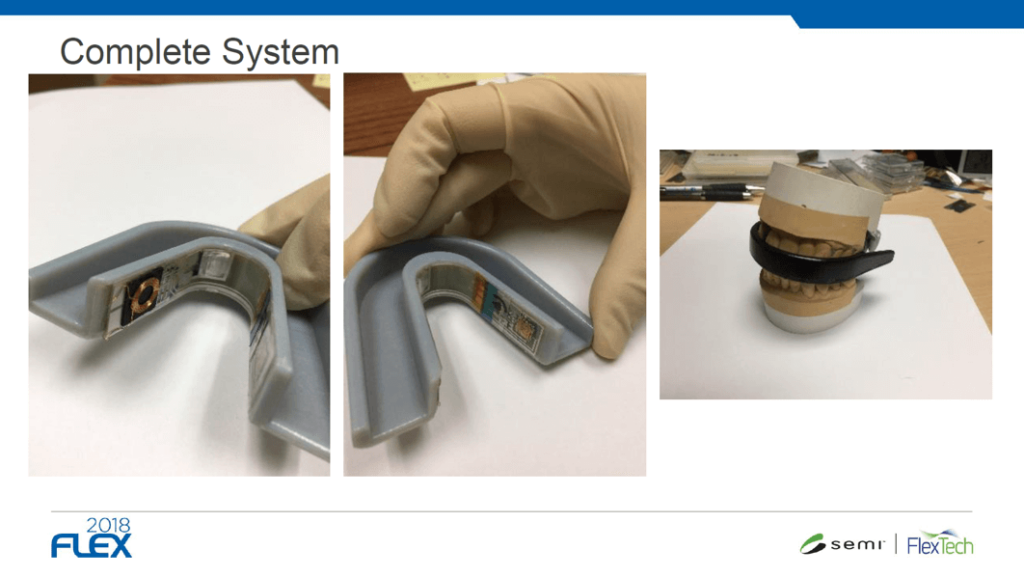 David Schwartz, the area manager at PARC, presented how his team, in cooperation with UCSD and NextFlex, developed a flexible hybrid electronics (FHE) -enabled mouth guard. They apply highly selective sensors to continuously monitor bioanalaytes from saliva, from which one might infer hydration and mental engagement levels. Schwartz stated that their results correlate better with a blood test results than with skin-patches that analyze sweat. He also described how PARC prints sensors and antennas into the mouth guard, visible in Figure 3 below.