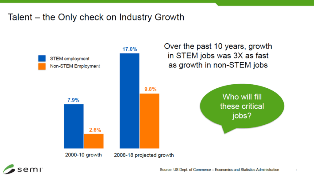Ajit Manocha, SEMI’s president, and CEO welcomed the many attendees on Tuesday morning. Because our highly technical and rapidly changing industry needs many more workers educated in science, technology, engineering, and mathematics (STEM) fields, Manocha also highlighted a few compelling facts to encourage young people to study STEM topics. (Figure 1)