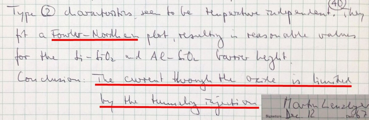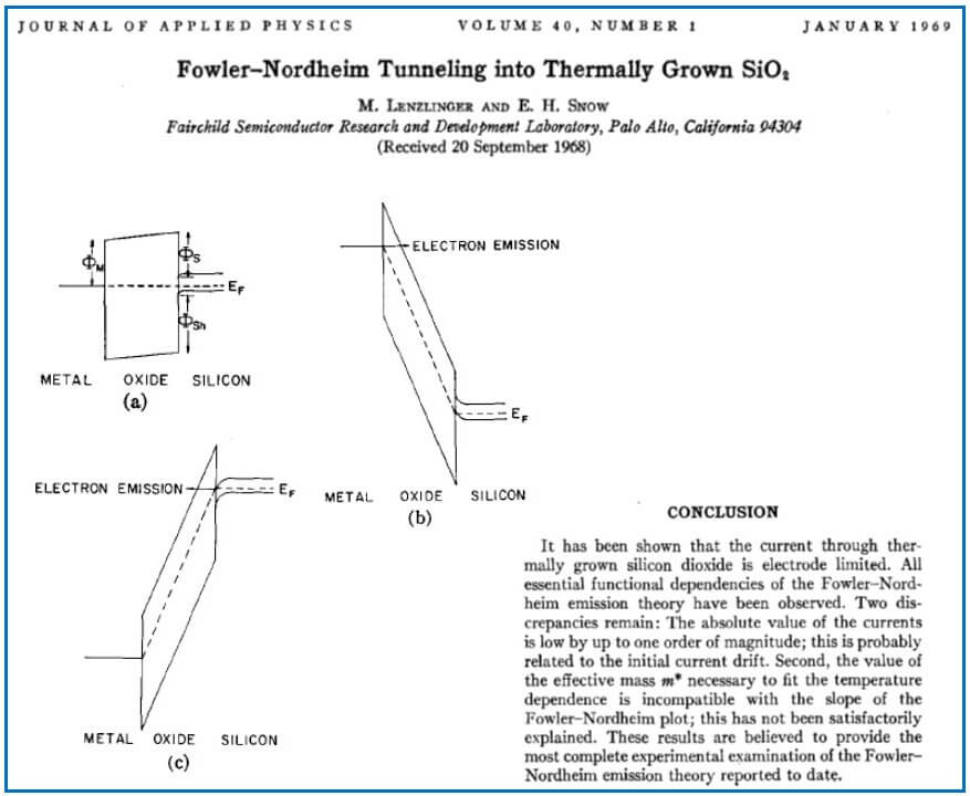 Lenzlinger was studying the conduction properties and breakdown in thermally grown silicon dioxide. After “burning” away weak spots in the oxide (in a fuse-like manner), he managed to reproduce the Fowler-Nordheim tunneling conduction that Snow had achieved with magnesium as the capacitor metal electrode and extended it to aluminum as the electrode.