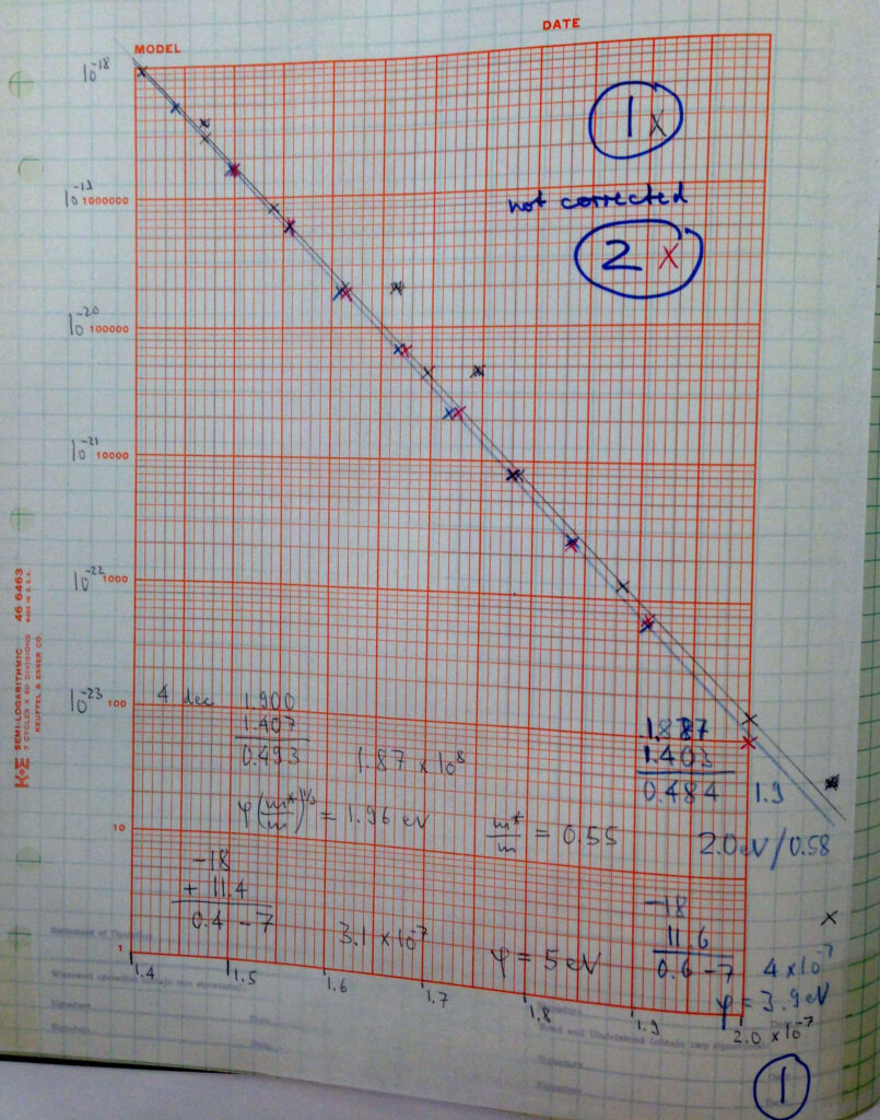 Figure 15 shows the “Fowler-Nordheim plot” from Lenzlinger’s laboratory notebook of December 1967 where the y-axis is the logarithm of the (current density divided by the square of the electric field) and the x-axis is the inverse of the electric field.