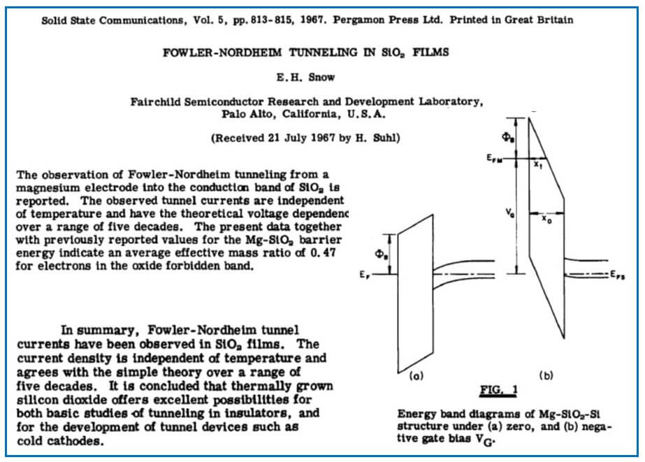 Edward Snow at Fairchild published a paper in Solid State Communications in October 1967 (received July 1967). Figure 13 shows excerpts from his “Fowler-Nordheim Tunneling in SiO2 Films”.