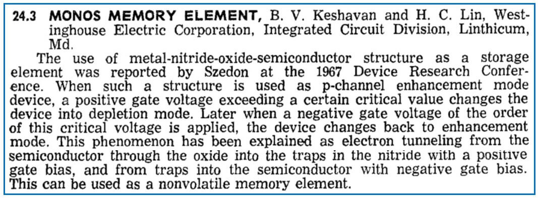 These fundamental studies in the late 1960’s, focusing on the two types of charge storage in a MOSFET (Metal-Oxide-Semiconductor-Field-Effect-Transistor), silicon nitride-based and floating conductor-based, set the scene for a proliferation of further work and the first silicon integrated circuit nonvolatile memory products within the next decade and laid the foundation for the rise of NAND Flash and the solid state data storage revolution. ~ Andy Walker