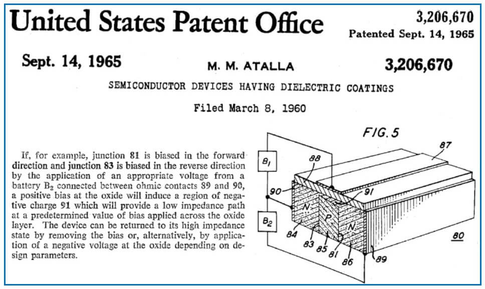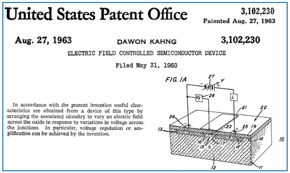 At the end of the 1950’s, Bell Laboratories in New Jersey had already established itself as the center for semiconductor research and development. Practical implementations of the field effect transistor, originally invented by J.E. Lilienfeld in 1925 and O. Heil in 1934, had been elusive until it was found that oxidation of a silicon surface resulted in a silicon dioxide (glass) layer that was stable, had a high dielectric strength and passivated the silicon surface by removing the effects of charged surface states. This then allowed an external transverse (perpendicular to the surface) electric field to modify the electrical conduction properties close to the silicon surface. Figures 8 and 9 show excerpts from D. Kahng and M.M. Atalla’s silicon field effect transistor patents. Both worked at Bell Laboratories.