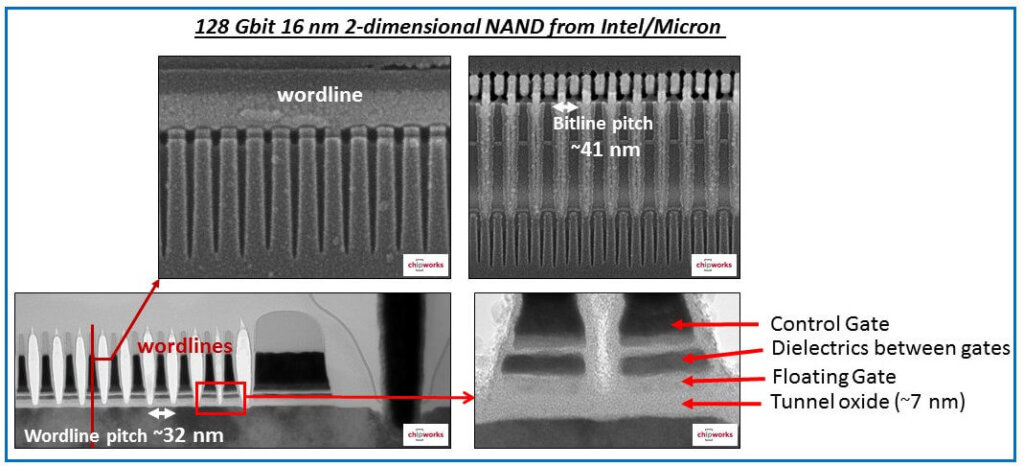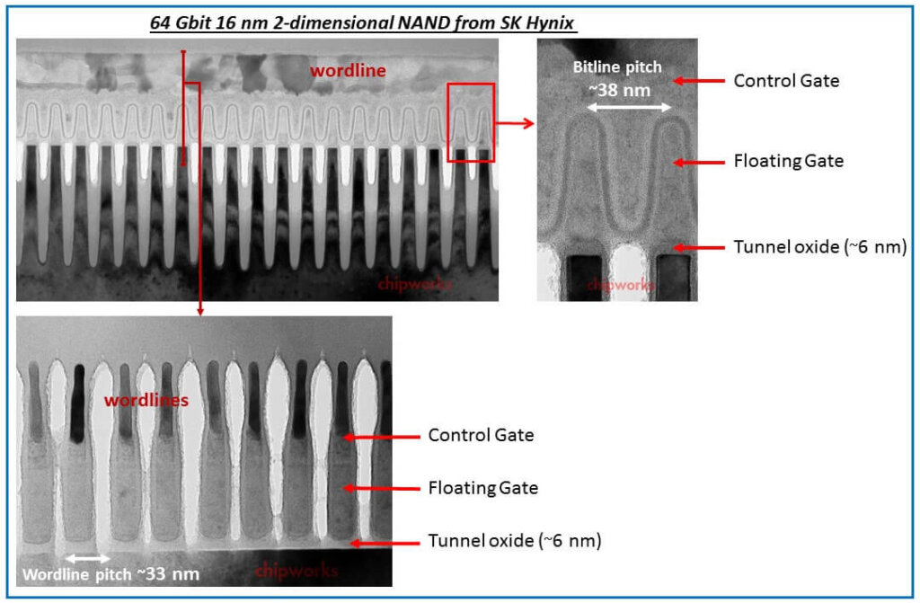 Figures 22 and 23 show high-resolution transmission electron micrographs of two of the most advanced NAND Flash chips in the market today. Both are made using 16nm NAND Flash technologies. The fundamental structure of D. Kahng and S.M. Sze (Figure 12) and E. Harari (Figure 18) is evident with the floating gate buried into a MOSFET structure.