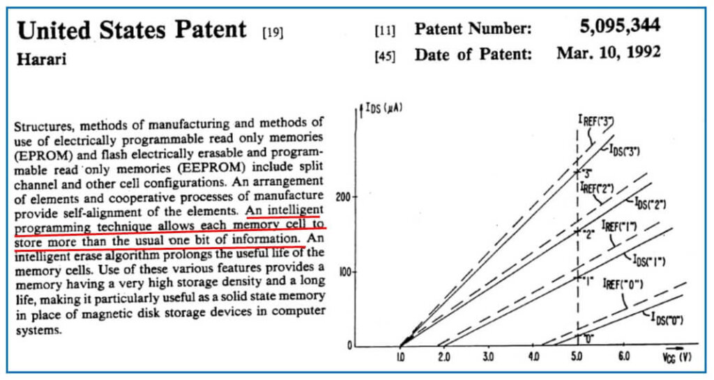 - Methods had been invented around the time of NAND’s introduction to store more than one electrical bit per cell by controlling the number of electrons that tunnel into the floating gate. This multi-state approach effectively increases the digital data density in the NAND chip. Figure 20 shows the introduction of this approach.
