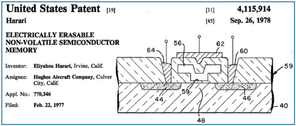 Figure 18 shows excerpts from Eli Harari’s 1978 patent on the silicon electrically erasable nonvolatile semiconductor memory where Fowler-Nordheim tunneling through a thin tunnel oxide to and from a MOSFET floating gate is used as the program and erase mechanism. This was the practical implementation of D. Kahng and S.M. Sze’s floating gate concept shown in Figure 12 (see part 2).