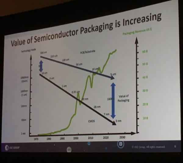 So, while some would tell you that the industry is facing crisis and dilemma with the slowing of Moore’s law; a 1600x gap between lithography and packaging feature sizes (Figure 1) and China tariffs that will impact supplies and leave big question marks on industry growth; from Wu’s perspective, these are merely hiccups that offer great opportunity for the microelectronics and packaging sector of the industry.