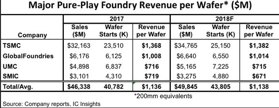 The Oct 12th issue of the McLean report, issued by IC Insights, reveals that the average revenue generated from processed wafers among the big four foundries (TSMC, GlobalFoundries, UMC, and SMIC) is $1,138 in 2018 (200mm-equivalent wafers), which is flat from $1,136 in 2017.