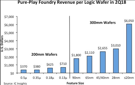 The revenue generated is highly dependent upon the minimum feature size of the IC processing technology. Figure 2 shows the typical 2Q18 revenue per wafer for some of the major technology nodes and wafer sizes produced by pure-play foundries.