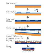 In chip-first (RD-last) FOWLP, plastic or metal carrier wafers are laminated with double-sided, sticky tape. Known-good dies are picked-and-placed followed by overmolding. The reconstituted wafer is then debonded from the carrier using a thermal release process, followed by RDL (Figure 4).