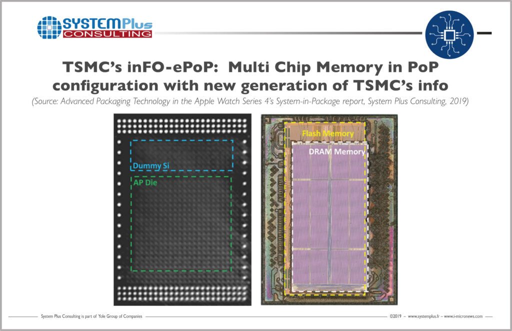 Stéphane Elisabeth, Ph.D., expert cost analyst at System Plus Consulting comments: “With the Apple Watch Series 4, the leading company has chosen to collaborate with many innovative partners including TSMC. Therefore, the application processor (AP) packaging is based on TSMC’s integrated fan-out (inFO) technology in the last version, called inFO-ePoP coupling Multi-Chip Memory with the AP.”