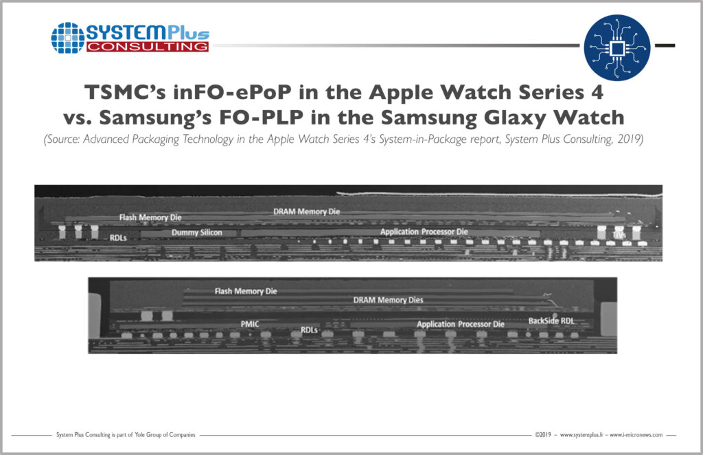 Stéphane Elisabeth, Ph.D., expert cost analyst at System Plus Consulting comments: “With the Apple Watch Series 4, the leading company has chosen to collaborate with many innovative partners including TSMC. Therefore, the application processor (AP) packaging is based on TSMC’s integrated fan-out (inFO) technology in the last version, called inFO-ePoP coupling Multi-Chip Memory with the AP.”