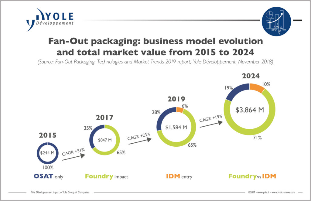 The fan-out packaging market value is expected to grow at a 19% CAGR between 2019 and 2024, reaching a market size of US$3.8 billion. Meanwhile, the love-hate relationships and politics surrounding OSATs, IDMs, and foundries will continue to unfold. Any big change in fan-out strategy will have a ripple effect on the entire supply chain.